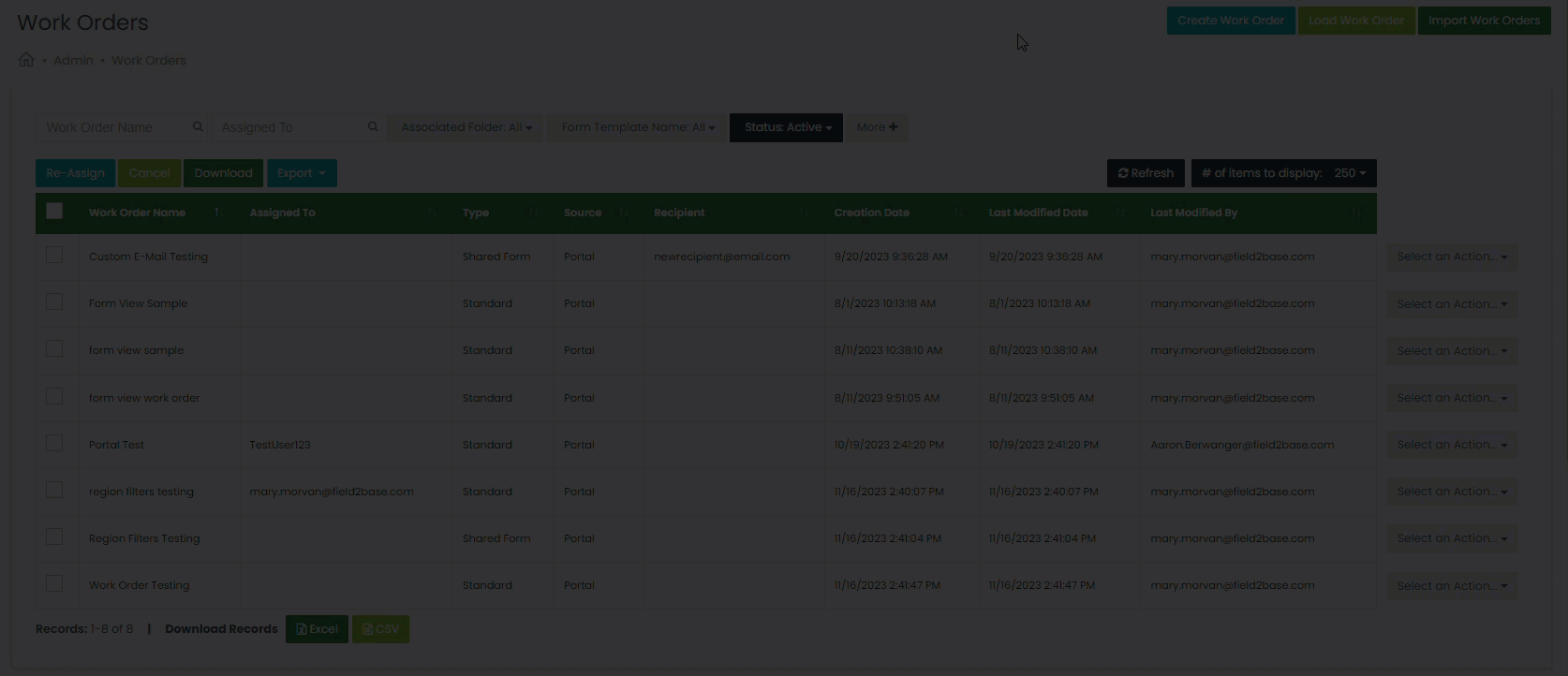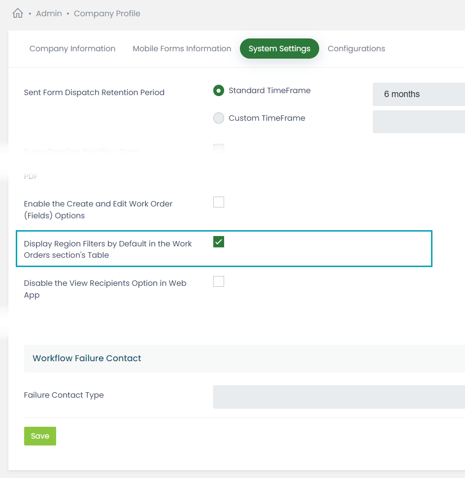 We also added a setting, "Display Region Filters by Default in the Work Orders section's Table", to the Admin > Company Profile > System Settings section. Mobile Forms Administrators can uncheck this company-wide setting to default to not display Region Filters in the Work Orders table.