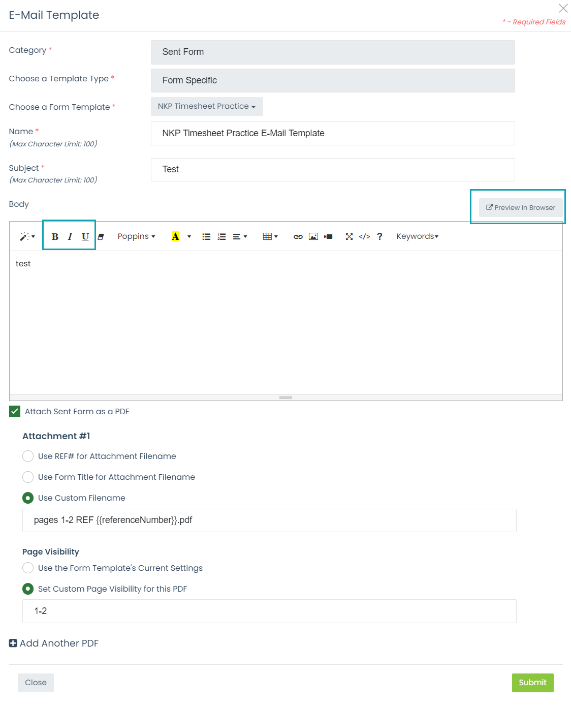 Mobile Forms Administrators now have a clearer E-Mail Template Editor to create or edit E-Mail Templates. We added the ability to format text with italics, removed the unused Foundation Framework option and updated the preview link to a Preview in Browser button.